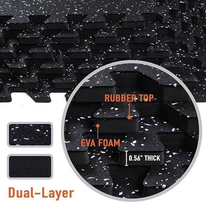 - [Upgraded Dual-Layer Design]: Concerned about your equipment scratching the floor during workouts? Our 2in1 Rubber Top EVA Foam Exercise Gym Mats are crafted to solve this issue. The textured rubber top layer, combined with a high-density EVA foam bottom layer, seamlessly creates a non-slip tough surface with excellent shock absorption.