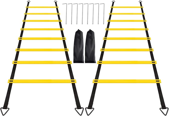 • 【Ideal Exercise Tool】- This agility ladder set includes everything you need to whip yourself into shape. It includes 2pcs 13ft 8 rungs agility ladder, 8pcs steel stakes for added stability, and 1pcs carry bag.