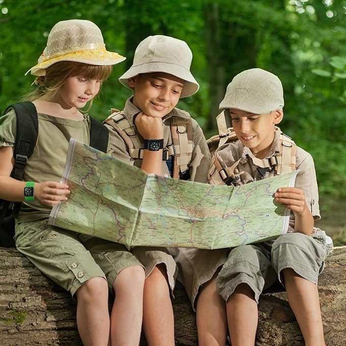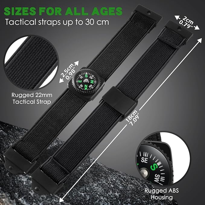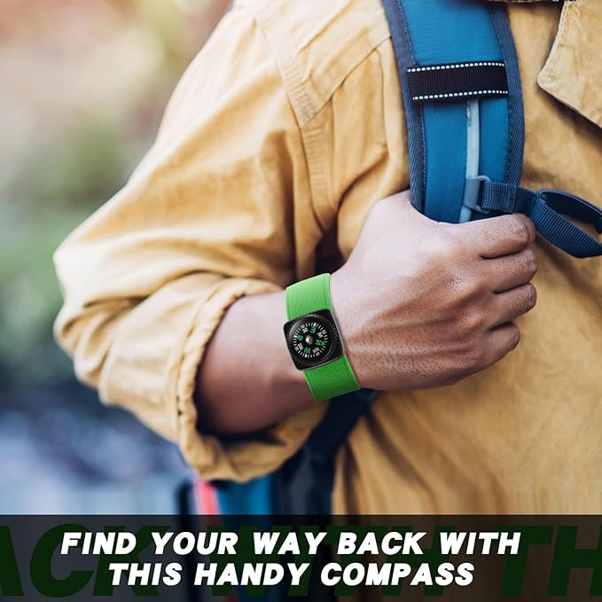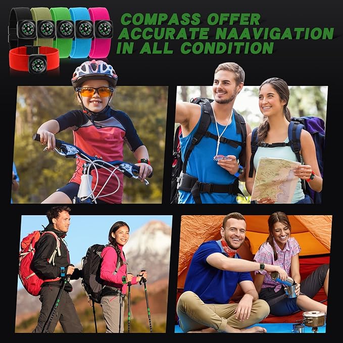 - Durable and Sturdy: our camping survival compass for kids is made up of polyester and gum silk material (wristband), the compass sits inside of the rugged ABS housing; This type of material is known for its strength and resistance, ensuring the compass can withstand the test of time and -20℃ to 50℃ outdoor environment for your adventures and explorations