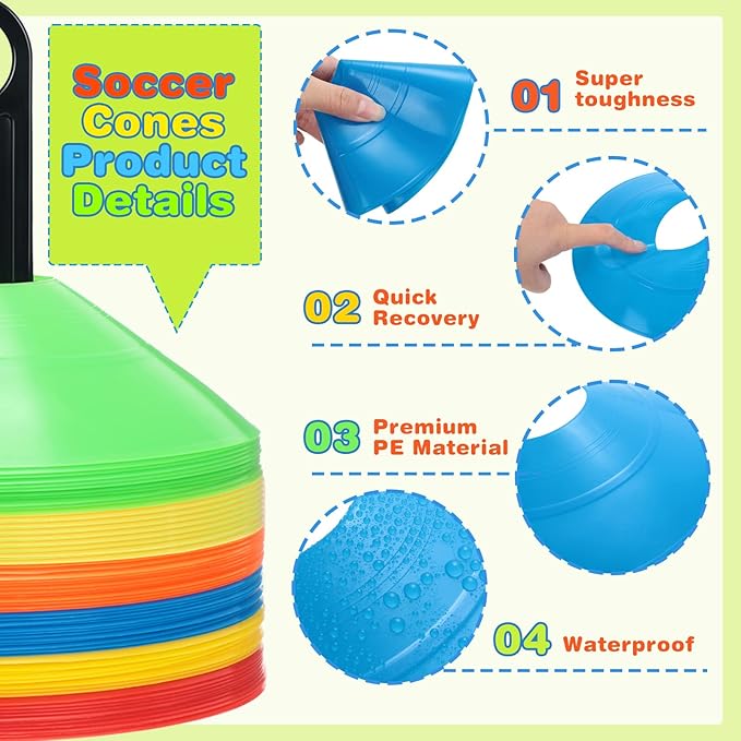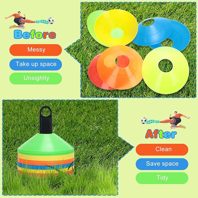 - Durable Training Cones: built to last, soccer training cones are durable and won't fade, don't worry about being blown away by the wind, pro disc cones will stay in the wind stably; You can stack the disc cones together with the matching stand and put in bag, easy storage and carrying; The toughness feature makes our marking cones not afraid of being stepped on by mistake, not easy to break, very durable and can be applied repeatedly