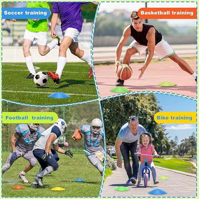 - Multiple Applications: the agility training cone set can be applied for both outdoor and indoor sports, on the field, court, gym, track, sidelines, or parking lot; Sport cones are approved by coaches, kids and parents in obstacle training and agility training, such as soccer, football, baseball, basketball, skating, skateboard, racing, and more; Games at themes parties and festive events, children's games, dog training and much more