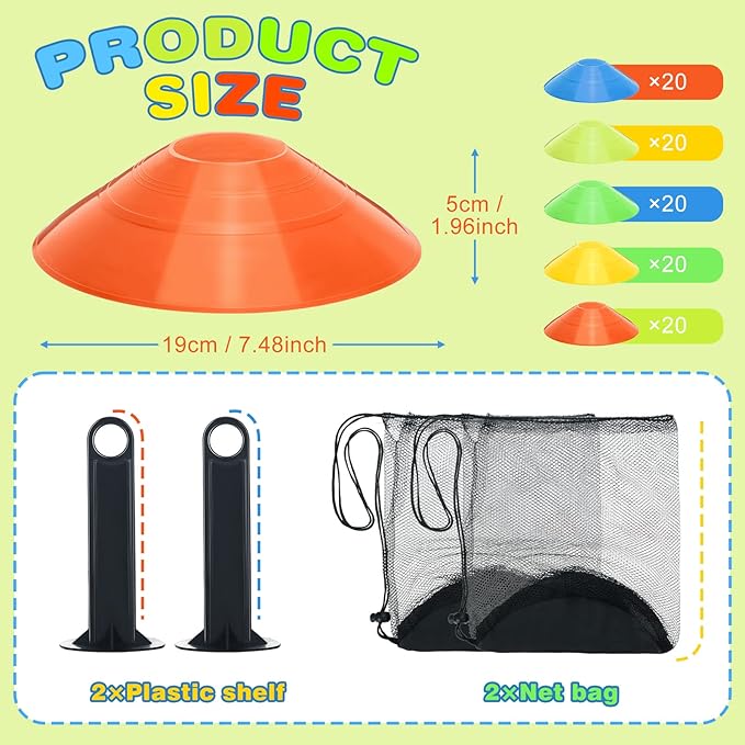 - Ultimate Training Set: 120 pack agility training disc cones with 6 colors, 20 pieces each color (red, blue, orange, fluorescent green, grass green), also includes 2 pieces mesh storage bags and 2 pieces disc cone holders; The disc cones set is sufficient for your daily training and sports practice
