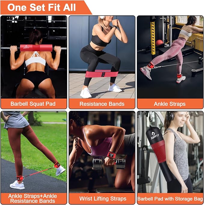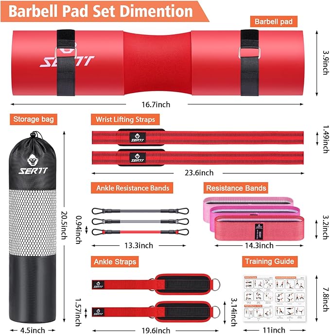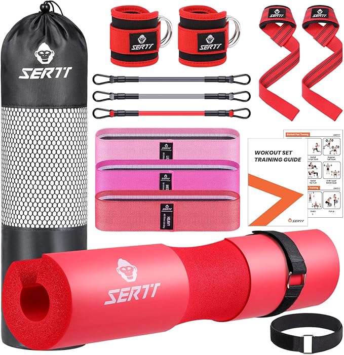 • All-in-One Gym Kit: SERTT gym kit includes 1* Barbell Pad with Drawstring Bag, 2* Weight Lifting Straps, 2* Ankle Cuffs, 3* Ankle Risistance Band, 3* Hip Resistance Band. Perfect for all fitness levels, whether you're a beginner or an experienced gym enthusiast, women or men, this barbell pad set is a must-have gym accessories for your fitness routine.