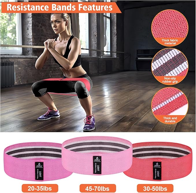 • Hip Resistance Band Features: There are 3 different levels of resistance namely Light, Medium and Heavy. Never worry about the hip bands being too stretchy or too small. Beisides, those exercise bands can help you with in a variety of workouts and Indoor and outdoor activities, including yoga, pilates, office sports, beach body workouts and more.