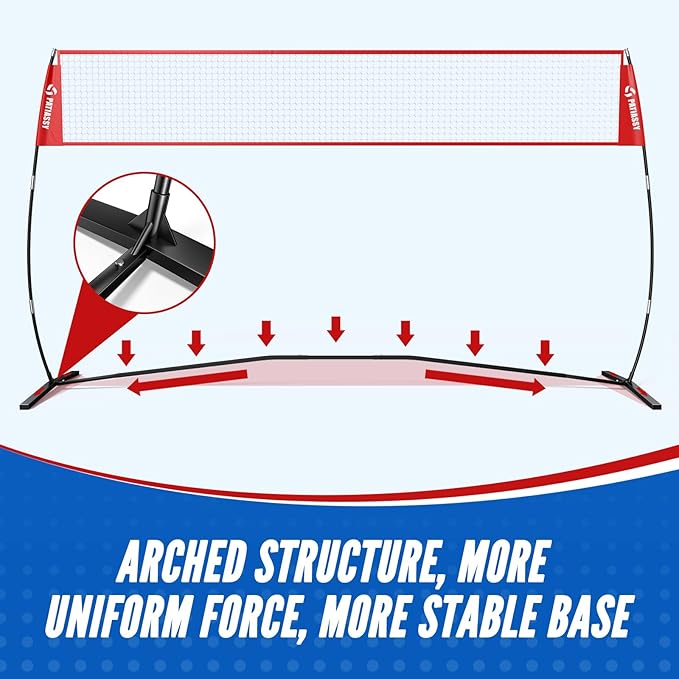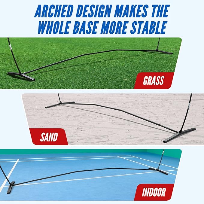 - Unique Base: The arch-shaped design evenly distributes the force on the entire base, providing stability and improved gameplay. No need for support ropes or sandbags. It can be set up anywhere, from grass to sand, gym floors to concrete.