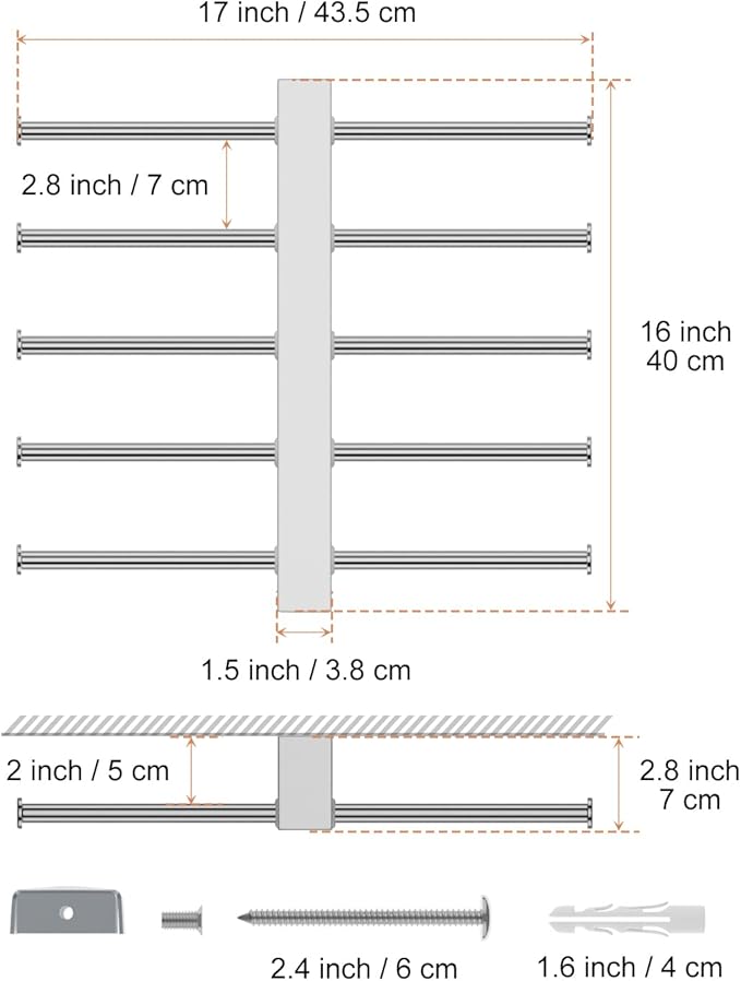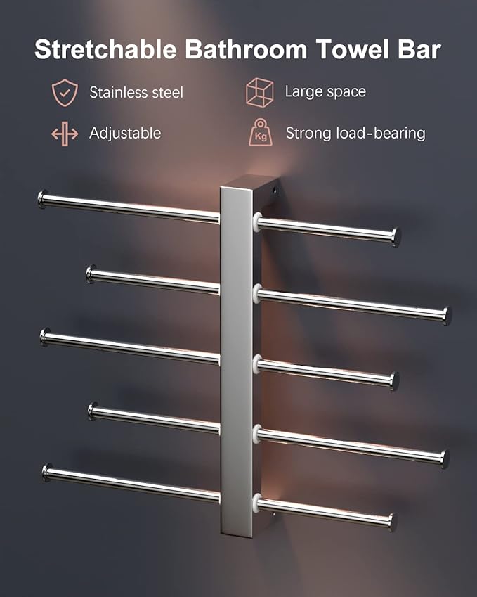 - Sizes and Material: Bridge sliding 5-Tier bath towel bar stretching on both sides can reach 15 Inch to 30 Inch, 1.5 inch/3.8cm tube diameter, screws length 2.4"/ 6cm, you can install it in any length if you wish. Constructed of premium thicken, ANTI-RUST solid and durable stainless steel. Perfectly smooth polished chrome finish is built to resist daily scratches, corrosions, and tarnishing.