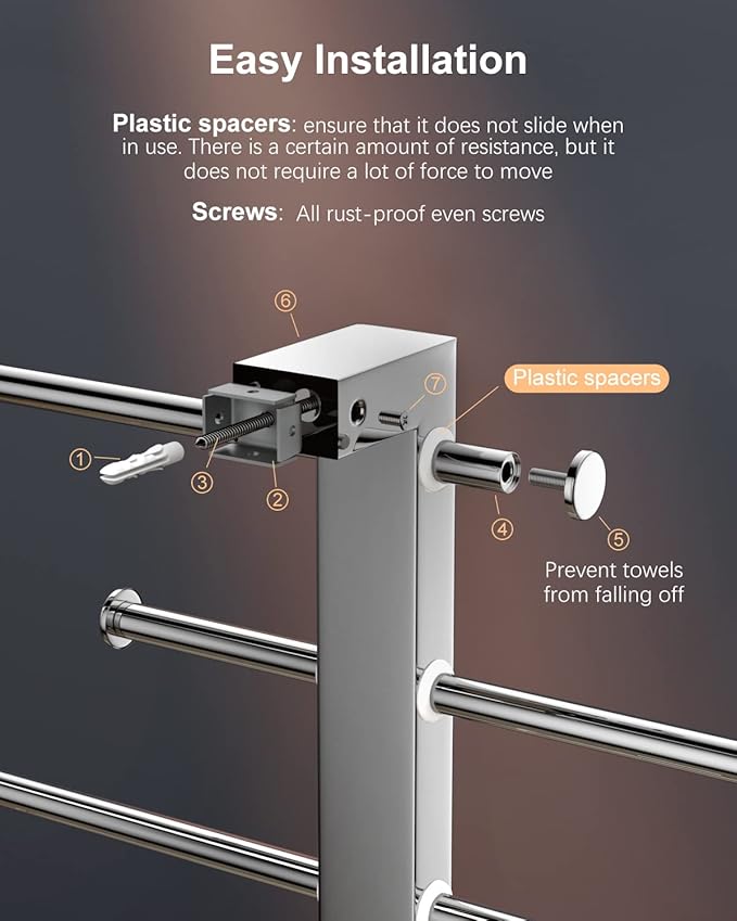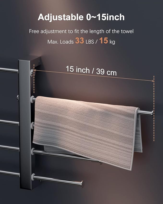 - Screw Mounted: Screws wall mounted installation with stainless steel screws and anchors in the package. Max. Load Weight of Bathroom Towel Holder: 33 lbs/15kg. Install must be smooth surface, but not limited to tile, wooden and wall, the Bridge sliding expandable towel bar can be used in kitchens, baths, and laundry rooms. The bars are positioned at equal distance from each other to ensure the towels stay fresh and ventilated.
