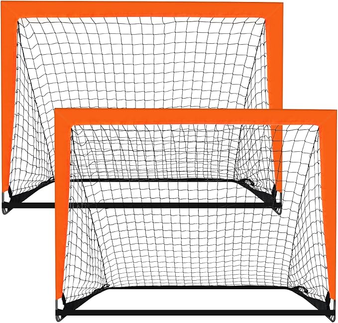 - Package and Size: 2 foldable soccer goals, 2 storage bags, 8 ground spikes, size 37x46.7x37 inches.