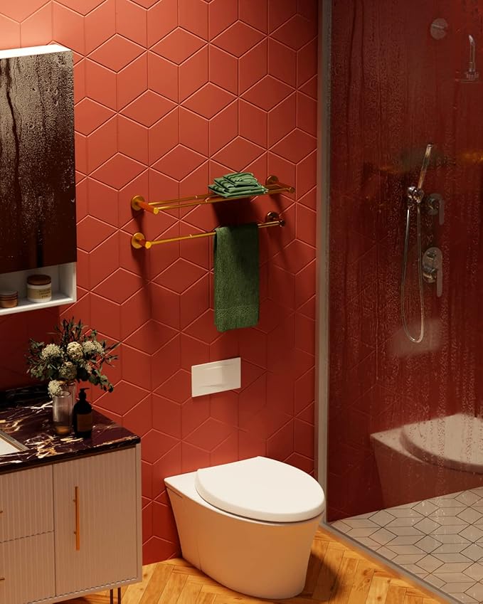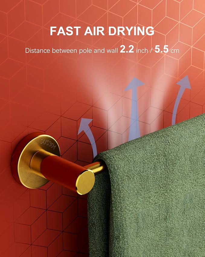 - Sturdy, Durable and Modern Design: Simple and stylish style in your bathroom, never out of date and reliable. Sleek surfaces, no sharp edges, safely hang the bath towel, bathrobe, pants and shirt, swimsuits, coats, bags, shower caddy or other stuff. 304 stainless steel to make the gold towel rod more durable and more anti-rust.