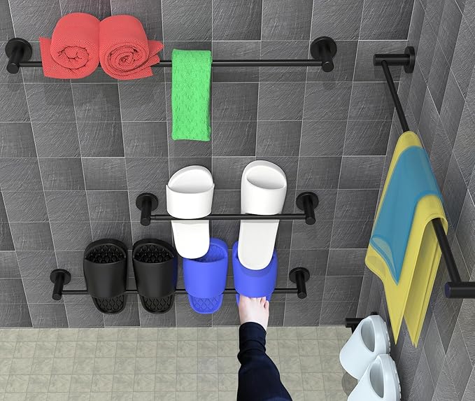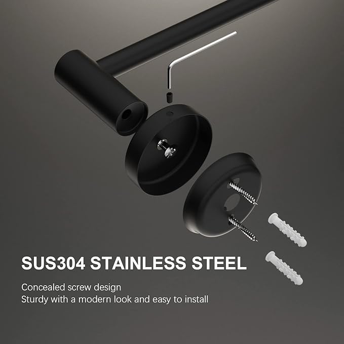 - Sturdy, Durable and Modern Design: Simple and stylish style in your bathroom, never out of date and reliable. Sleek surfaces, no sharp edges, safely hang the bath towel, bathrobe, pants and shirt, swimsuits, coats, bags, shower caddy or other stuff. 304 stainless steel to make the black towel rod more durable and more anti-rust.