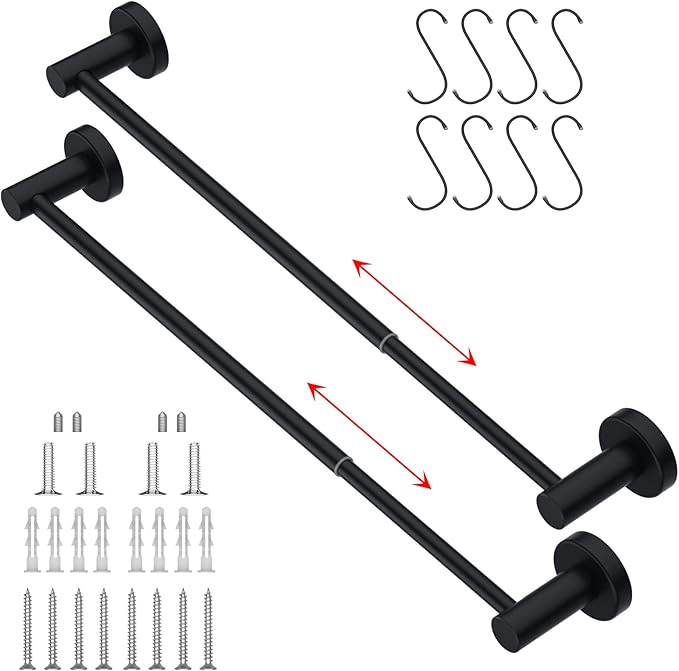 - Retractable Size & Material: 2 pack retractable black towel bar from 16 to 27.6 Inch, to meet the needs of different spaces, you can install it at any length. 1 inch(25mm) tube diameter. Made of oil rubbed black finished SUS304 stainless steel for a lasting strength and quality.