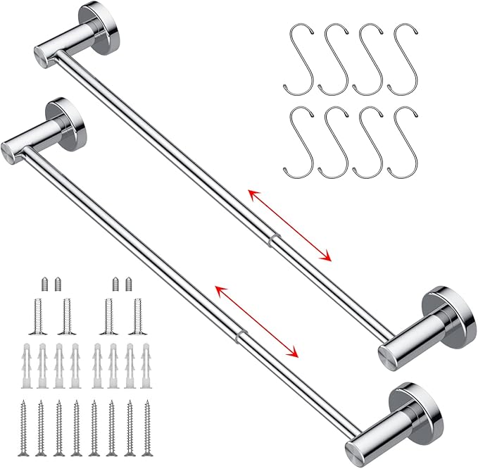 - You Will Get:1 * Retractable Bathroom Towel Bar,2 * Screws Bag(Stainless Steel),4 * S-shaped Hooks,1 * Instruction Manual.If you have any problems after receiving the Towel Bar, please contact us anytime you want and we will try our best to give you a perfect solution.