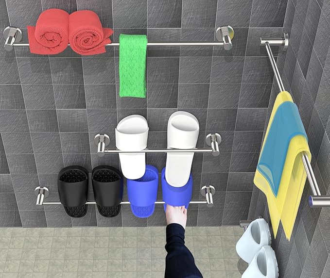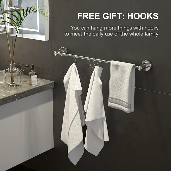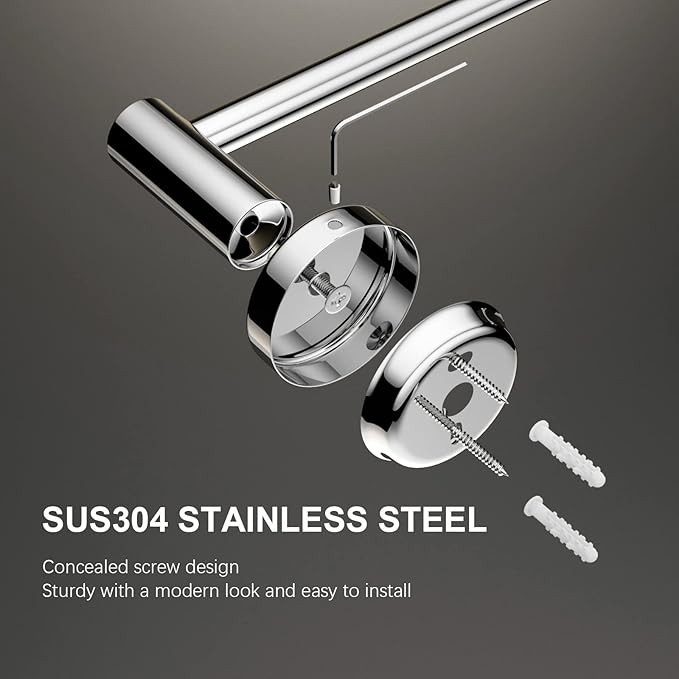 - Sturdy, Durable and Modern Design: Simple and stylish style in your bathroom, never out of date and reliable. Sleek surfaces, no sharp edges, safely hang the bath towel, bathrobe, pants and shirt, swimsuits, coats, bags, shower caddy or other stuff. 304 stainless steel to make the towel rod more durable and more anti-rust.