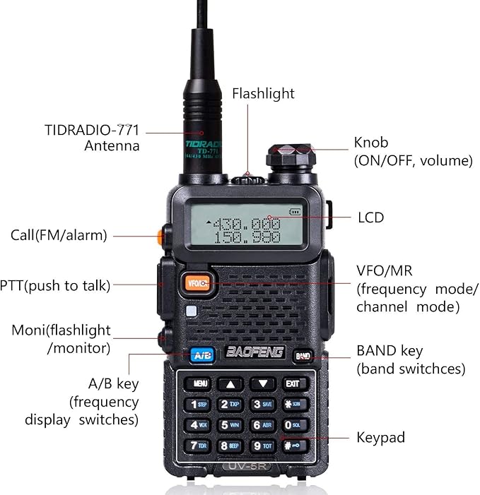 - [Practical Functions]: BaoFeng uv5r radio is a beginner-friendly radio which has multiple functions and is easy to learn and operate. Functions: Dual-band display, Dual Freq. Display, Dual Watch, VOX, Busy Channel Lock-Out, Scan, Monitor, Voice Prompt, Built-in LED Flashlight, Emergency Alarm.