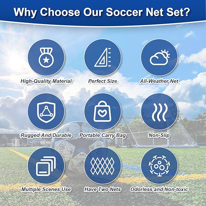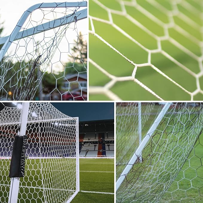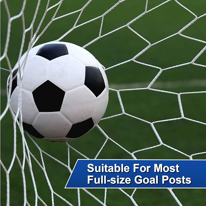 - 【High Quality Material】Our football goal net is non toxic and odorless polyester material, which has the characteristics of sun protection, rainproof, weathering, corrosion resistance, non fading, complex netting process, and professional production equipment
