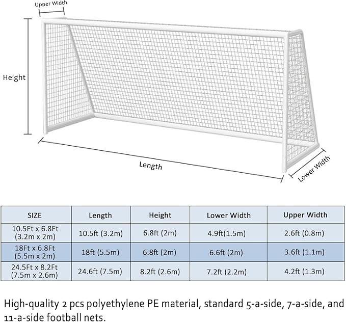 - 【High Quality Material】Our football goal nets are made of odorless, non toxic polyethylene material, with excellent low temperature resistance (the lowest operating temperature can reach -70~-100℃, the highest suitable temperature can reach 140℃), and it is chemically stable. Good performance, can withstand most acid and alkali corrosion, low water absorption, excellent electrical insulation performance
