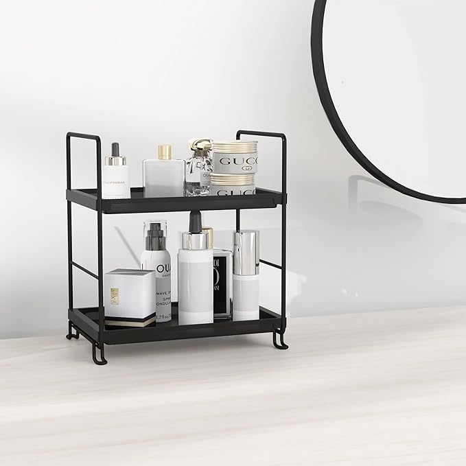 - EASY TO USE: Stackable design for increased vertical storage, no tools required, easy to assemble. Easy to clean, all you need is a rag. Four non-slip rubber feet on vanity counter shelves feet prevent damage to tabletop