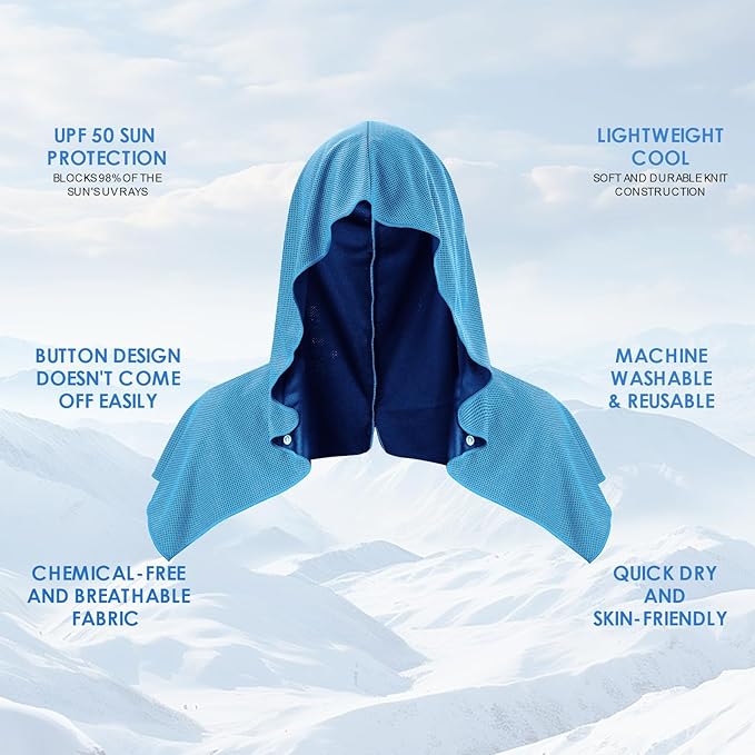 - 【QUALITY MATERIAL】:Cooling hoodie towel is made of high-quality microfibers with a mesh pattern, is breathable, UV protection, lightweight soft, durable and easy to fold. Not only skin-friendly for the neck and face or other body areas, it's also chemical-free and safety for all users. The special structural design allows it to maintain cooling and dissipate heat in summer.
