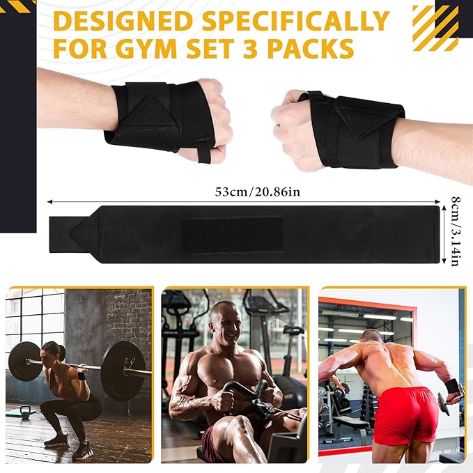 - Ultimate Wrist Support and Comfort: the gym set comes with weight lifting wrist wraps, made from polyester fibre, approximately 3.15 x 20.87 inches in size; The straps offer ideal wrist support, allowing you to adjust the tension as you see fit; You can tighten or loosen the straps to your desired restriction, without causing discomfort or circulation obstruction due to stiff edges; Ensuring your wrists are supported throughout your workout