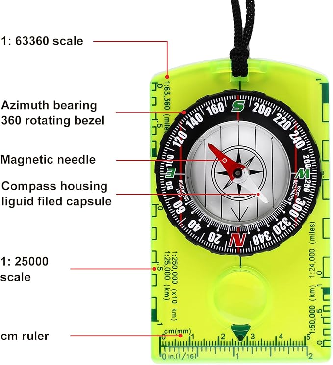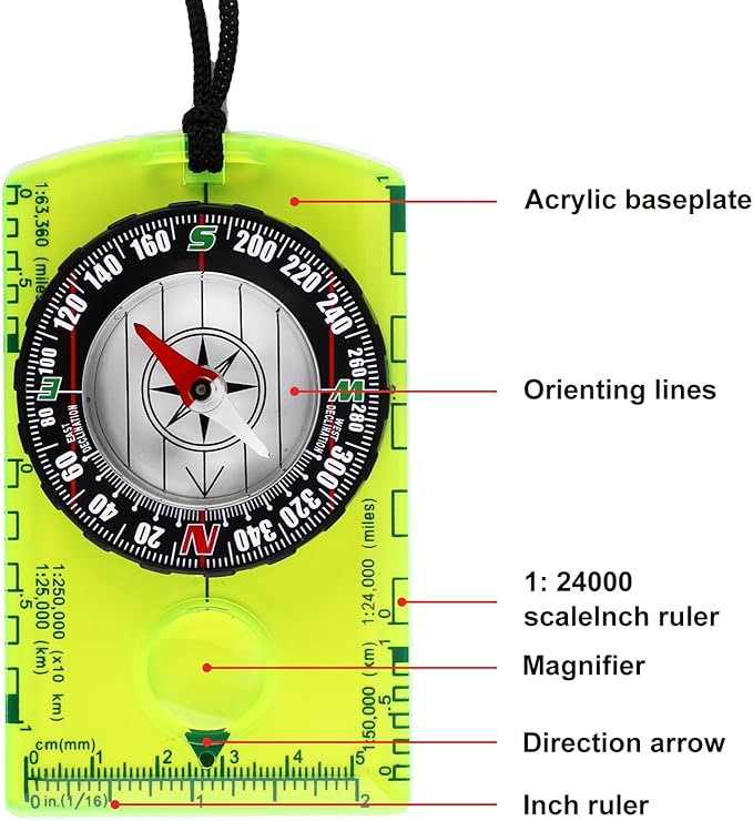 - 360° Rotating Bezel: The red pointer of the scout compass is always pointing north preciously. With 360° rotating bezel and direction bearing, you can easily read the specific orientation. Thick and sturdy plastic base can withstand multiple drops but still work normally.