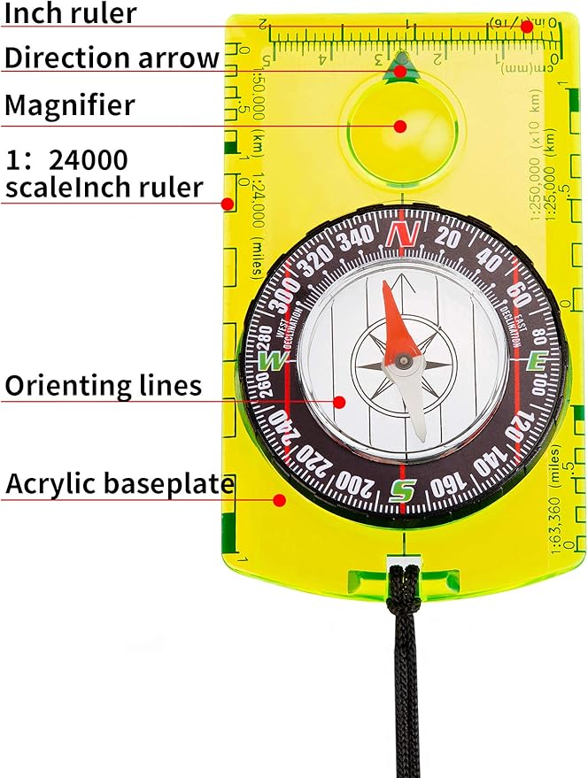 - Practical design: our scout hiking compass has 360 degree swivel bezel, for cartographic map navigation and reading; It also has field compass located magnifying glass, compass ruler and 1 : 25000 compass scale
