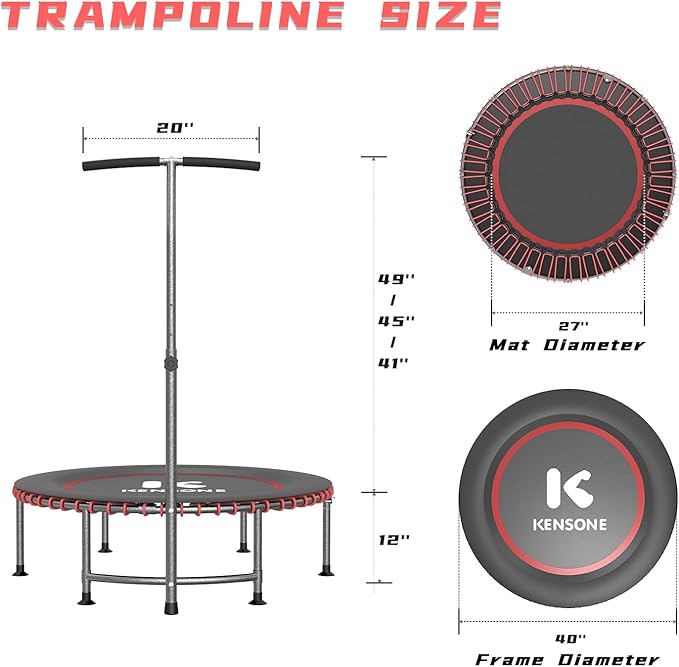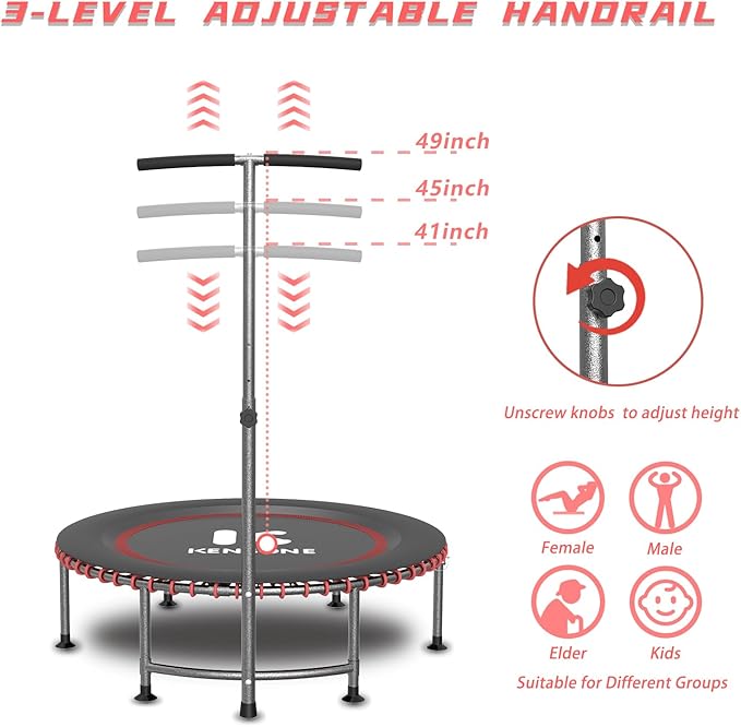 - 【ADJUSTABLE HANDRAIL】The height of the handle bar is ranged from 41” to 49”, measuring from the jumping mat. It can meet the needs of people of different heights, like women, men and elders.