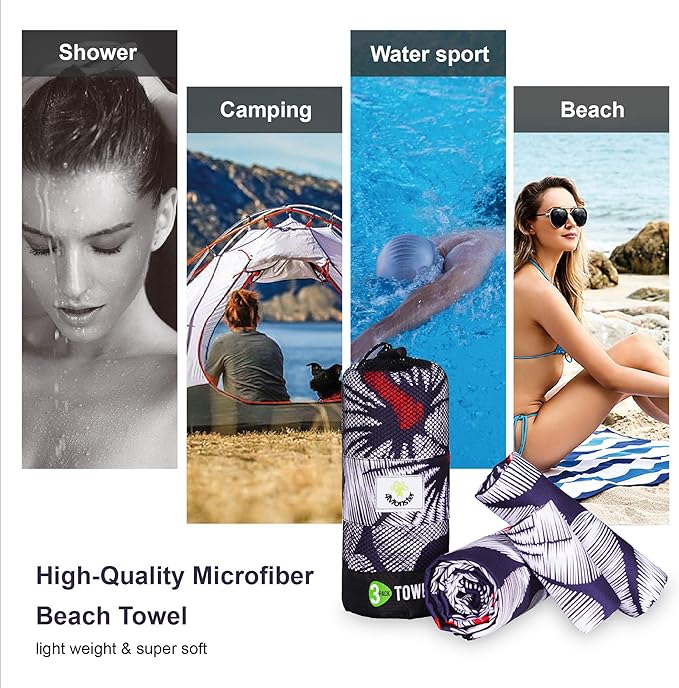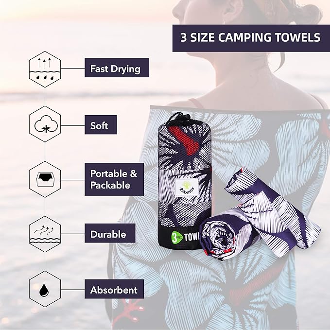 - 【3 Towels at 1 Pack】The package contains 3 towels of different sizes, (S:15''x15'') is a small hand towel and prefect for gym and yoga class,light and soft, absorb sweat quicker than you imagine.(M:30''x15'') is a prefect camping towel and you’ll find the size just designed for traveling.(L:60''x30''),the biggest towel in the package,the size is for shower,beach and pool,large yet light and portable.