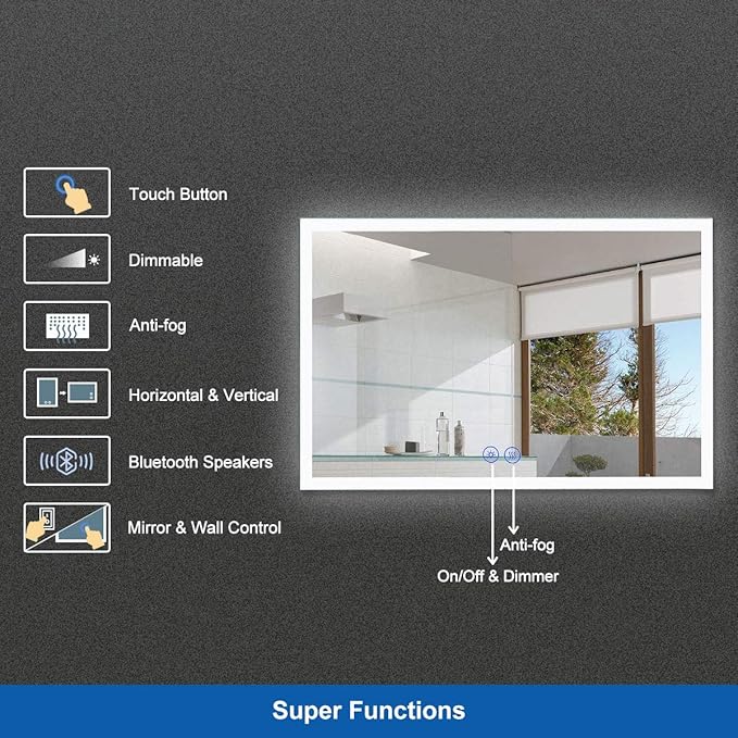 - *Bluetooth and ANTI-FOG:This LED Mirror with Bluetooth speakers and Anti-Fog function ! You can listen to your favorite music and answer a phone call while you do your makeup. It eliminates the troubling fog automatically. Don’t need to remove fog manually, no longer have to worry about the disturbing fog that will cover your beauty.