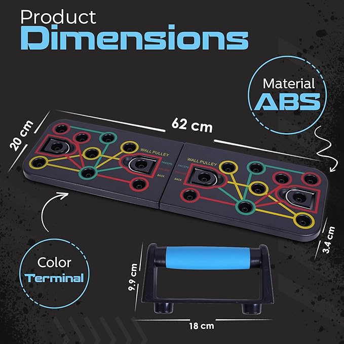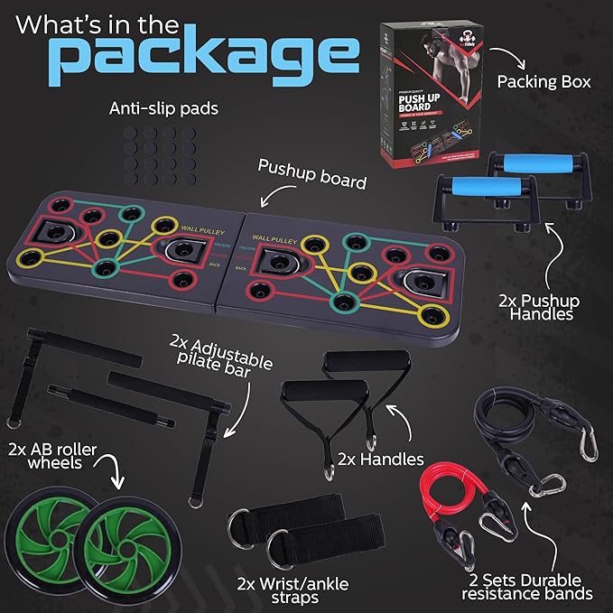 - Included Components : Push up Board, Resistance Bands, Abs rolling wheel, Pushup handles, pull up handle bars
