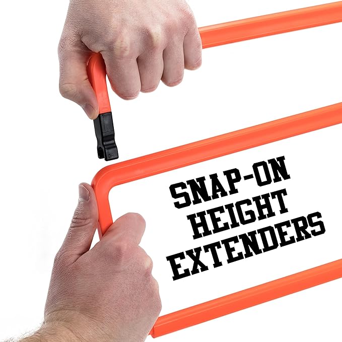 • Snap On Extenders: Increase workout intensity levels with two height extenders per hurdle, snap on and adjust hurdles to heights of 6", 9.25", 11.75", and 15". Each hurdle is a standard size of 45 cm wide