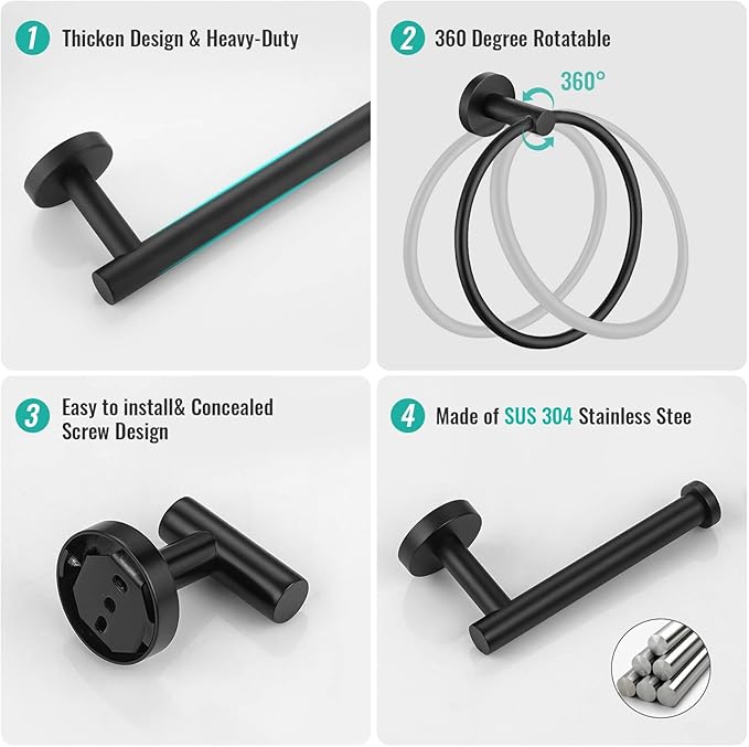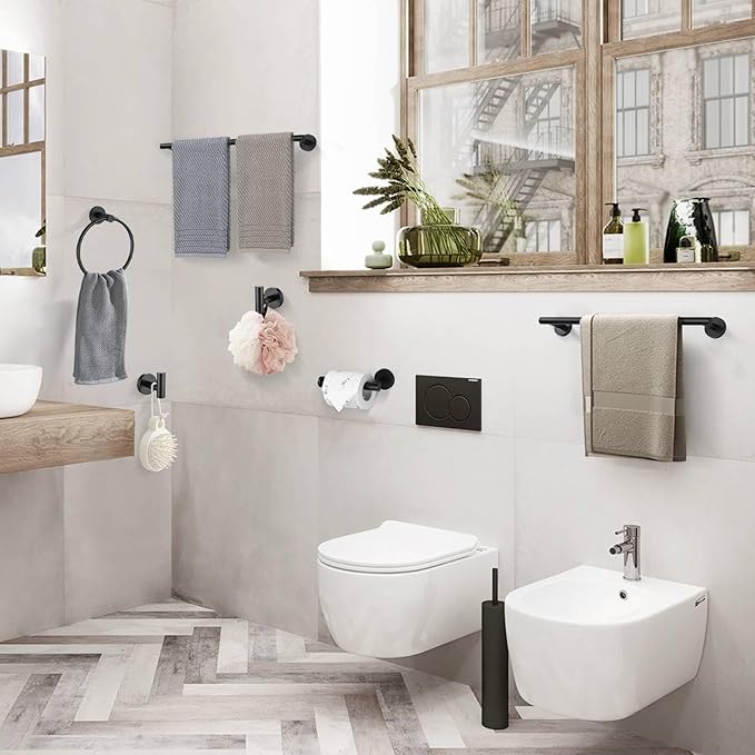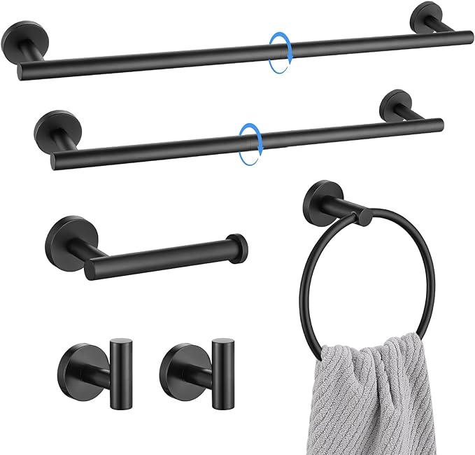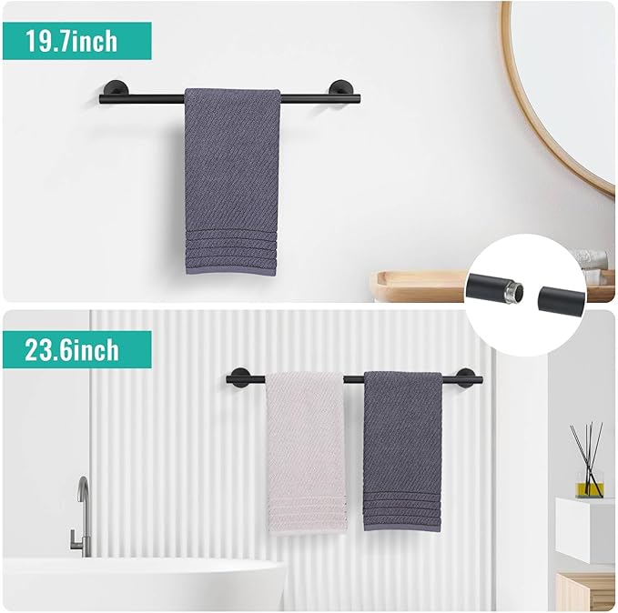 - Includes 1 x 23.6-inch splicable towel bar, 1 x 19.68-inch splicable towel bar, 1 x towel ring, 1 x toilet paper holder and 2 x coat hooks, which is completely enough.