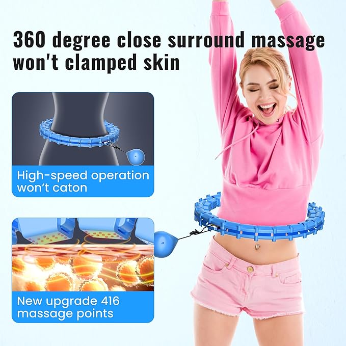 - 【Never Fall Off 】The upgraded Smart quiet weighted hoops are easier to use and never fall off. As the weighted fit hula rotates rapidly, the massage head (stronger spring and upgraded massage head with 416 massage points) will deeply massage your muscles, helping you loss weight and eliminate fatigue quickly. In particular, our weighted hoops are especially suitable for women who train for postpartum waist training and working people who sit in the office for a long time.