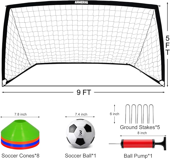 - COMPREHENSIVE SOCCER NET SET: Our all-in-one kids' soccer goal kit includes everything needed for a complete soccer experience. Each set comprises 5x9FT soccer goals, 1 standard size 3 soccer ball, 1 inflation pump with a needle, 8 soccer cones, 5 U-shaped metal ground stakes, and 1 carrying bag. Whether honing soccer skills or organizing a friendly tournament, this portable soccer goal set ensures unforgettable moments.