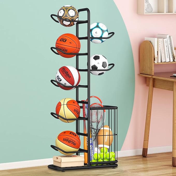 - 🏈【Multifunctional Ball Storage Rack】The sturdy matte spray-painted bracket of this sports equipment organizer can easily hold 7 full-size balls, including basketballs, making it an ideal basketball rack for balls. The storage basket can easily store other sports equipment or toys.