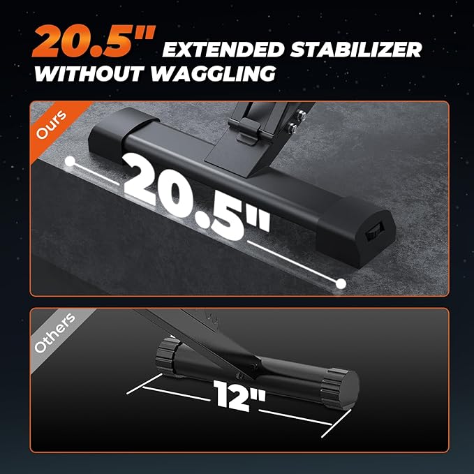 - 【Without Wobbling】This foldable workout bench is equipped with an extended stabilizer measuring 20.5 inches, featuring anti-slip foot caps and reinforced bolts. This provides the incline bench with robust stability, preventing any wobbling or side-to-side movement during exercise. The standard seat height of 17.7 inches ensures that your feet are flat on the floor, maintaining a stable center of gravity, regardless of the exercise position.