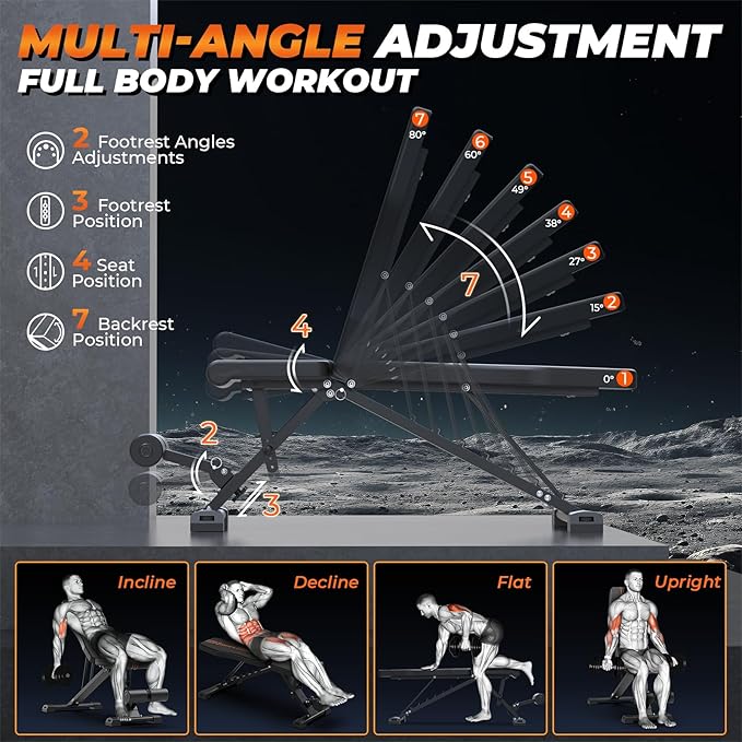 - 【Versatile Adjustable Foldable Weight Bench】Designed with 7 backrest adjustments, 4 seat adjustments, 3 footrest adjustments and 2 footrest angle adjustments, this adjustable weight bench offers people a full-body workout to strengthen and tone all your muscle groups to achieve your fitness goals, such as incline, decline sit-up and bench press. Foldable design makes it easy to store under beds or in cupboards to save space.