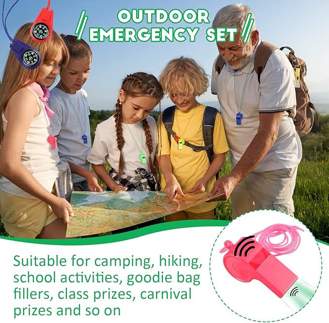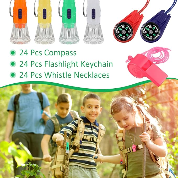 - Emergency Set: you will receive 24 compasses bulk, 24 whistles, 24 flashlights, 6 assorted colors, enough for your daily needs and replacement demands, sharing them with your family, friend or neighbors is also nice. For children over 6 years.