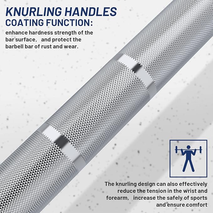- [Medium Barbell Knurling] The 28mm grip shaft with a 1.2MM medium-level knurling, and have a moderate whip, increases friction and improves the grip experience. The knurling design can also effectively reduce the tension in the wrist and forearm, increase the safety of sports and ensure comfort