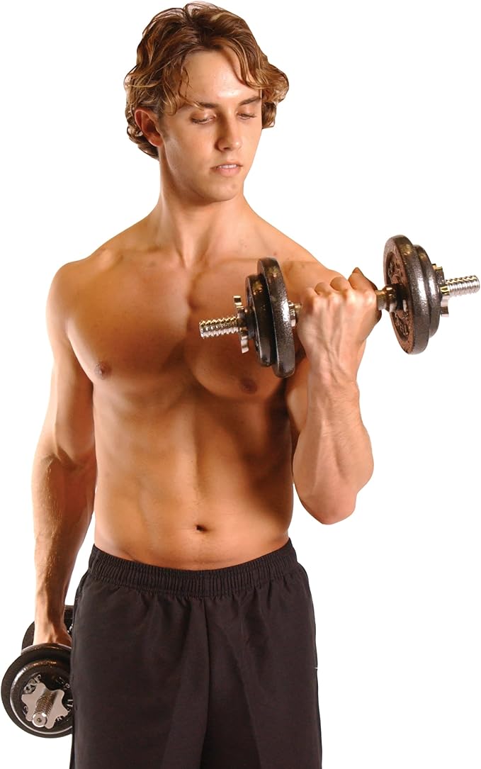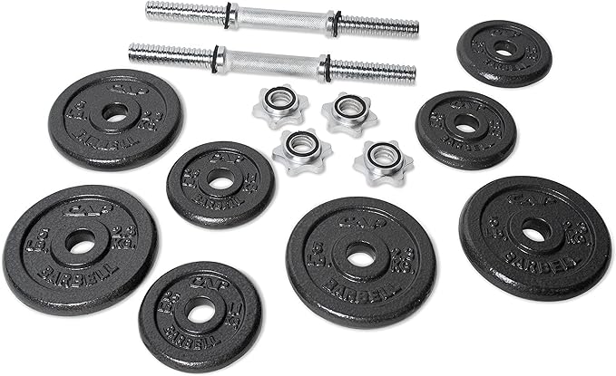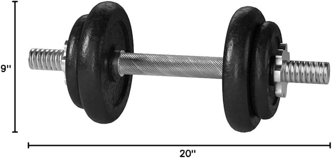 - Construction durable cast iron plates have a semi-gloss finish offers a rust and maintenance free product; Dumbbell handles are made from solid steel
