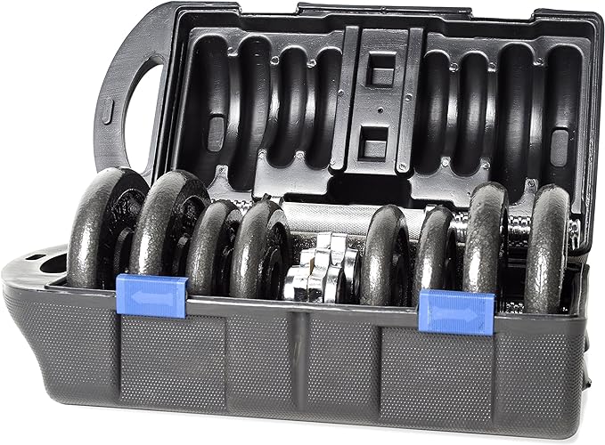 - What’s included 40 pound set includes 2 handles, 4 2.5 pound plates, 4 5 pound plates, 4 collars, and a plastic storage/carrying case