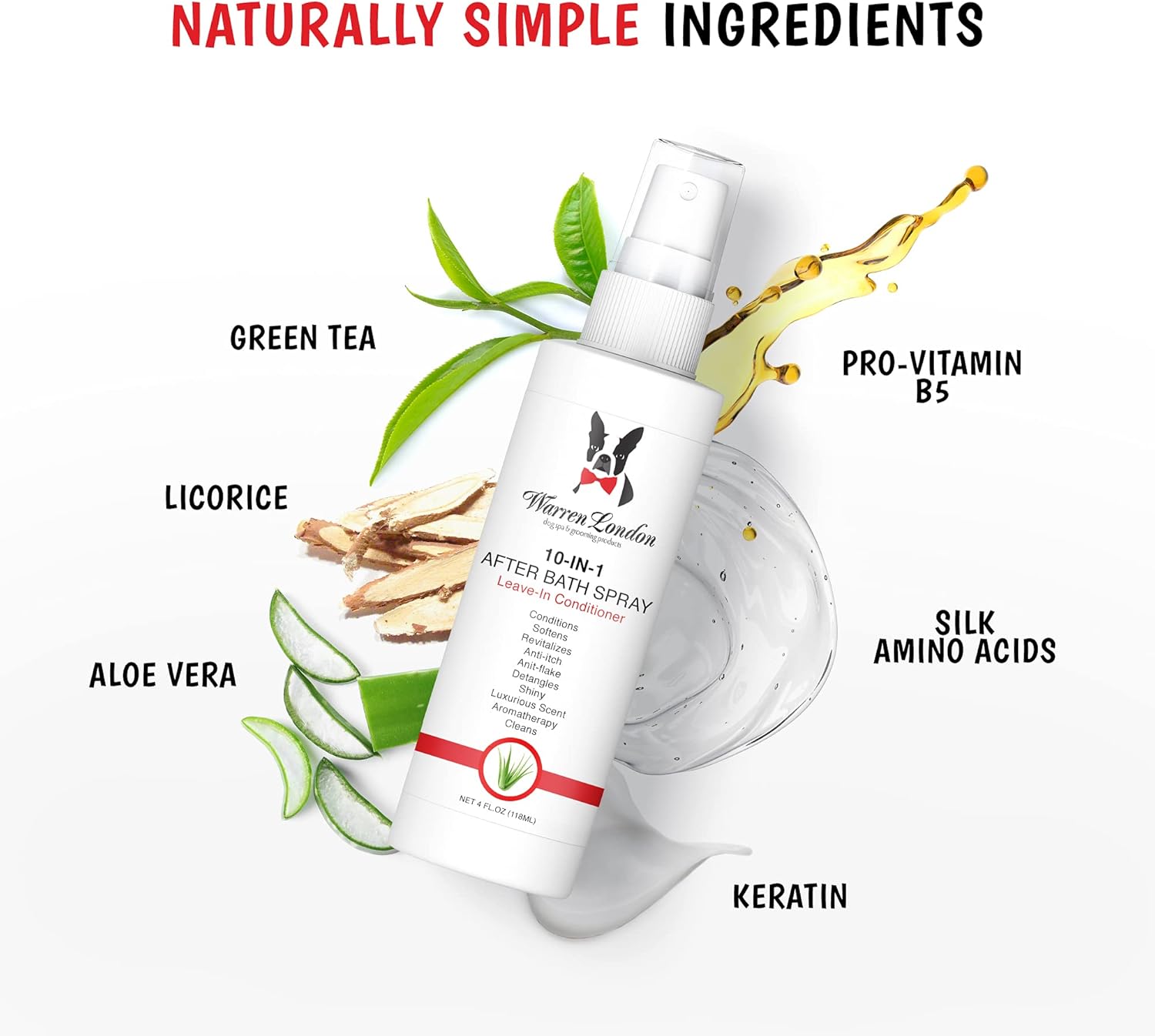 Warren London 10-in-1 After Bath Dog Spray | Leave-in Conditioner & Detangler for Dogs | Aloe Vera, Silk Amino Acids & Green Tea | Fresh Scent | 4oz Travel Size | Made in USA