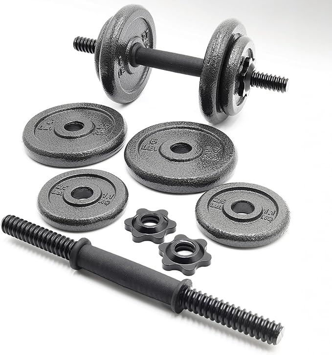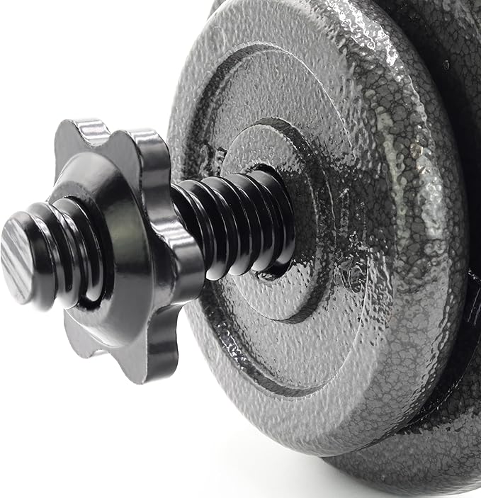 - Fully adjustable with four 6 lb plates, four 2.5 lb plates, 2 threaded solid dumbbell handles, and 4 spin-lock collars.