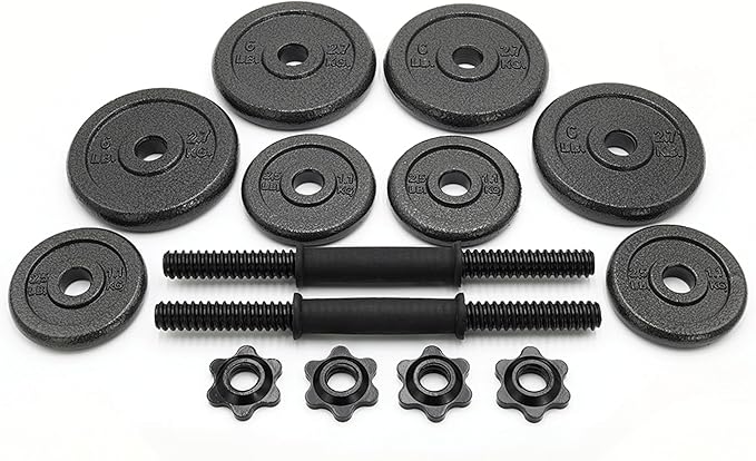 - Set comes with several weight plates that allow you to create different weight combinations with the dumbbells.