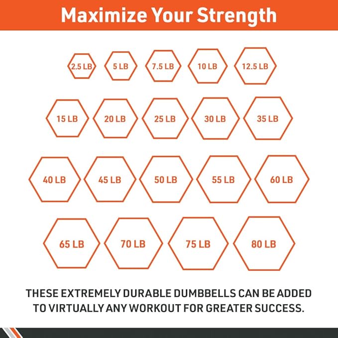 - DURABLE AND STYLISH - Solid rubber hex heads won’t roll or mark up your floors and look great; stainless steel shaft is covered in chrome for a polished, stylish look.