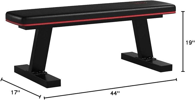- MAX CAPACITY OF 600 LBS – The maximum user weight capacity of this flat bench is 300 pounds minus the weights. It has dimensions of 44 (L) x 19 (W) x 17 (H) inches, meaning that it can be used for a variety of workouts.