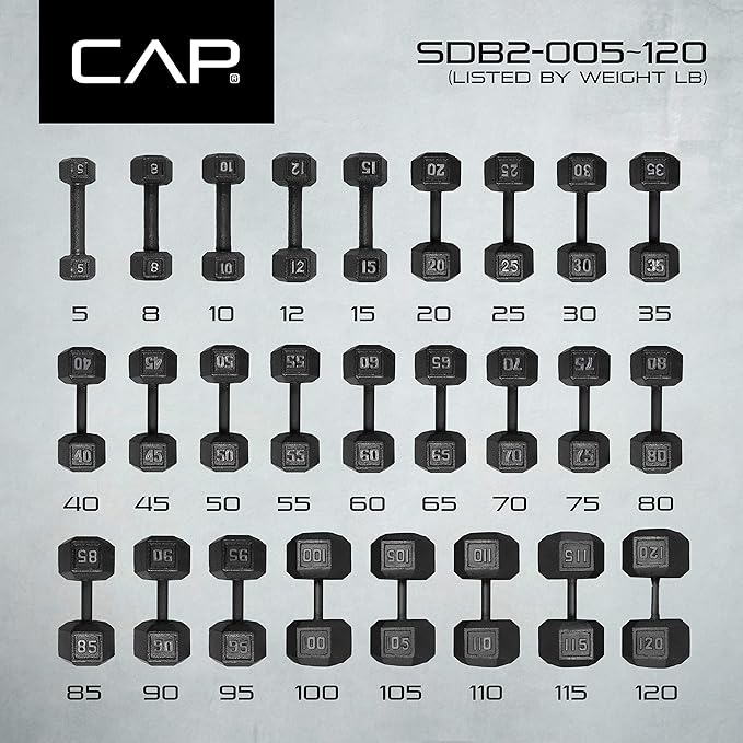 - CHOICES – This dumbbell group from CAP is available in sizes from 3, 5, 8, 10, 12, 15 - 120 lb. in 5 lb. increments.