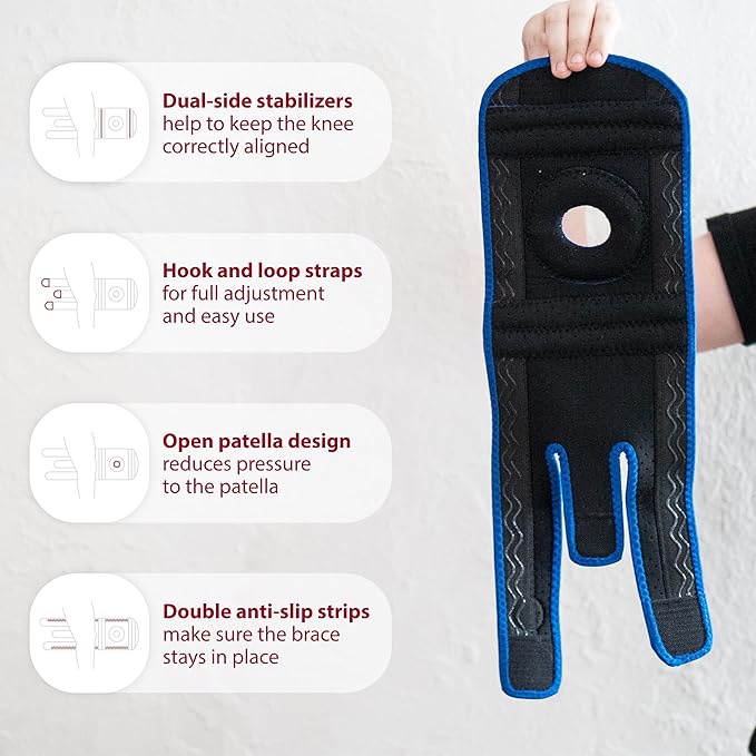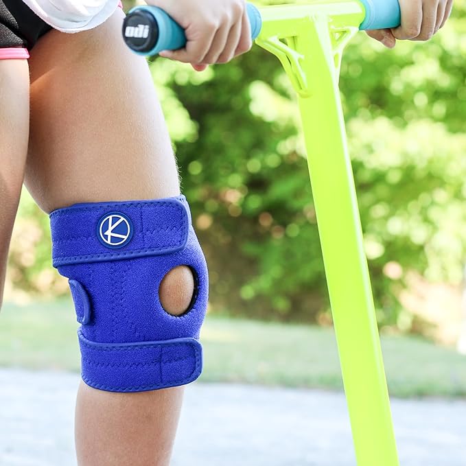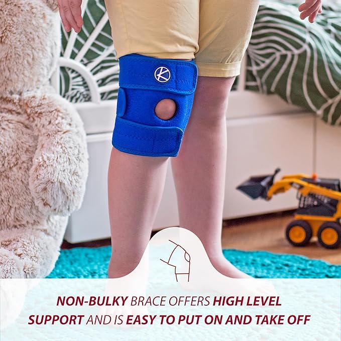 - Open Patella Knee Brace Support reduces pressure to the patella & underlying knee joint, making the patellofemoral knee brace perfect for daily usage. Perfect knee support to wear at home, during the school day, and when attending after-school activities and training. Kids' knee support is meant for walking, running, playing, gymnastics, hiking, bowling, biking, basketball, football, and other sports.