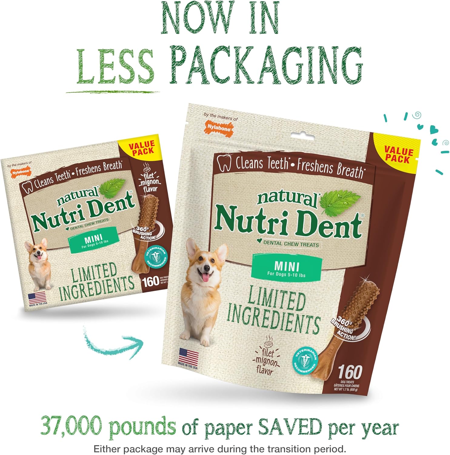 Nylabone Nutri Dent Dog Dental Chews - Natural Dog Teeth Cleaning & Breath Freshener - Dental Treats for Dogs - Filet Mignon Flavor, Mini (160 Count)