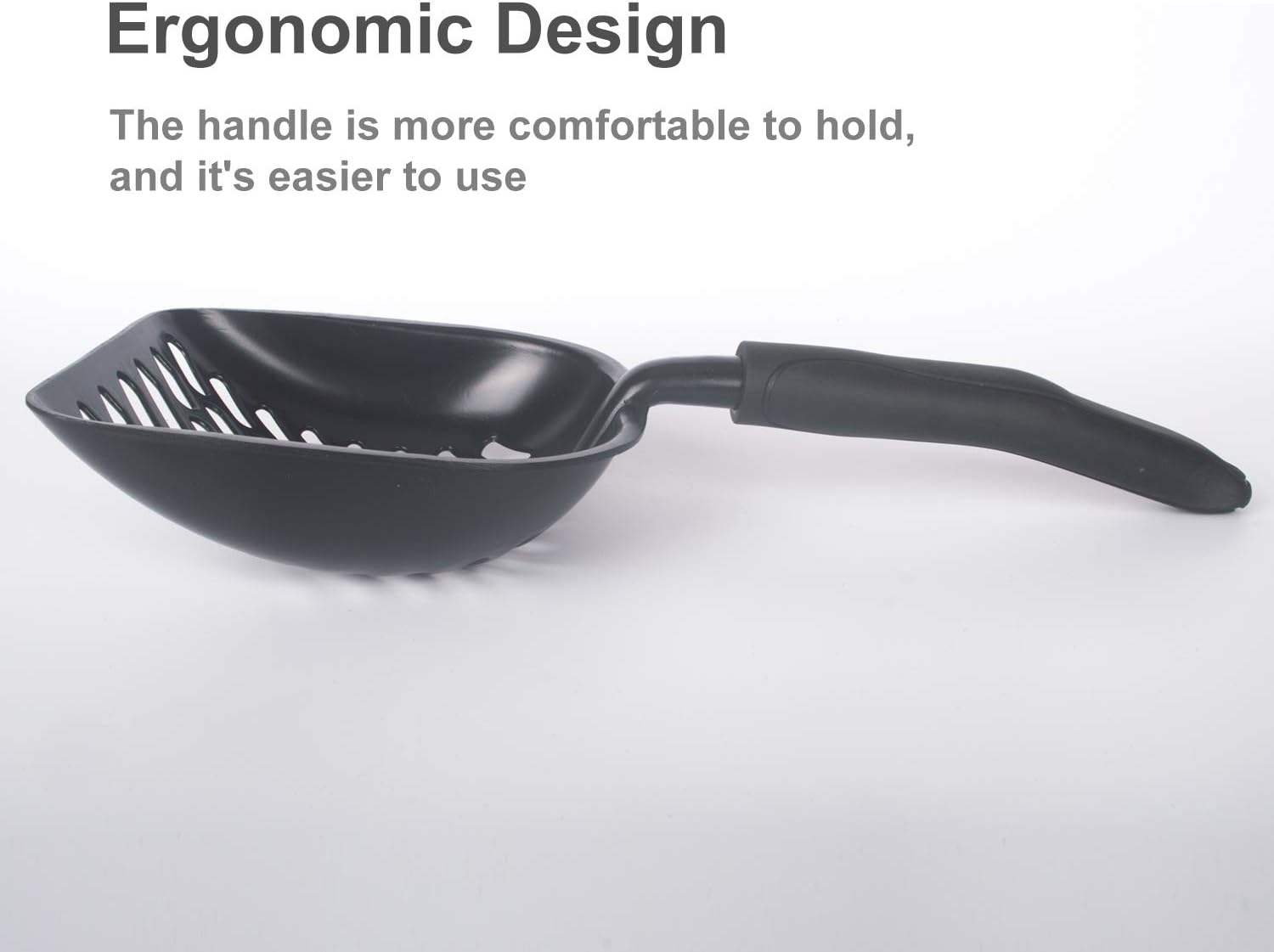 - ERGONOMIC DESIGN: The thick & soft 6.5” rubber handle gives a tight, non-slip grip & is perfect for any size hand. It is angled to reach the toughest spots of the litter box & is 13.75” total length
