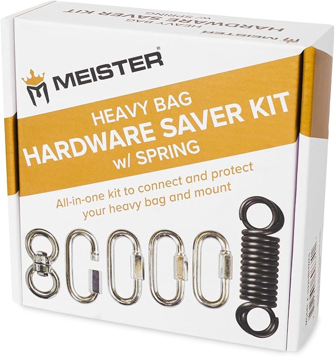 - Includes 4 screwlock carabiners, heavy duty swivel and Meister Heavy Bag Spring (for bags up to 250lb)